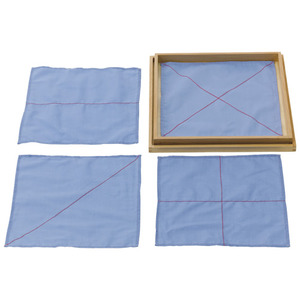 4種類の練習用の折る布です。折るところには、赤糸のステッチが入っています。ステッチにそって、布の角が重なりあうようにきれいにきちんと折ります。