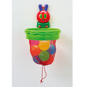 はらぺこあおむしの小さな玉入れです。S字フックや吸盤を使って、部屋やお風呂の壁などに取り付けて遊びます。