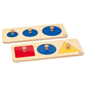 四角・円・三角の形の違いを理解して、パズルをはめこみます。円は大きさの違うパズルになっていて、大きさが違うと、はまらないようになっています。3ついっしょになっているので、形の違いや大きさの違いがわかるようになった子どもに。