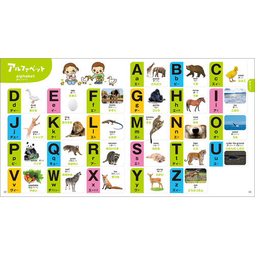 ひらがな、カタカナ、アルファベット、数、色、世界地図など、知育要素も充実。さまざまな分野の学びが詰まっています。ライオンやシマウマはアフリカ、コウテイペンギンは南極など、動物の生息地とともに世界地図も学べます!動物を通して楽しく学べる知育図鑑です。