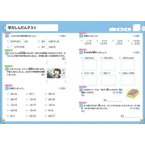 ・算数と国語には、最後に「学力しんだんテスト」がついています。力だめしと弱点克服に役立ちます。
