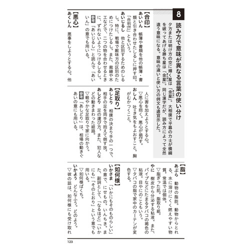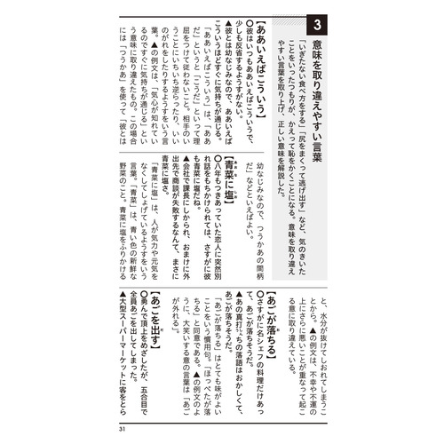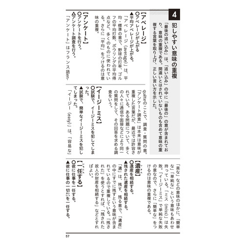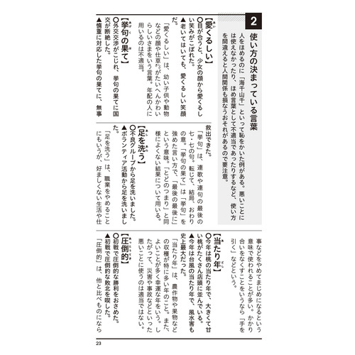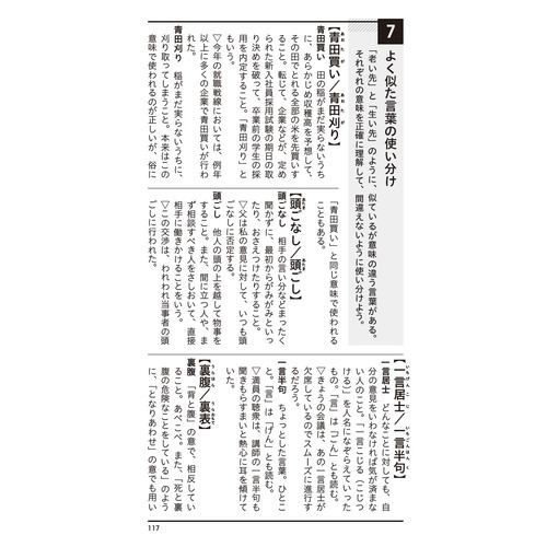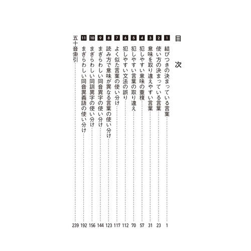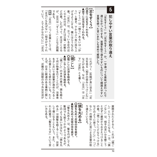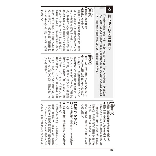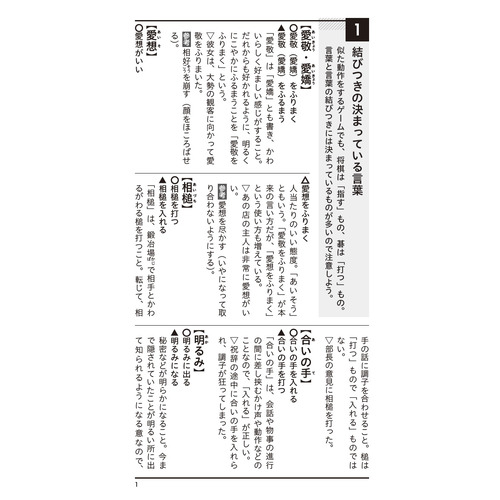 コロケーション、慣用句、誤用・誤読しやすい言い回しや漢字表現、同音異義語の使い分けなどを掲載。