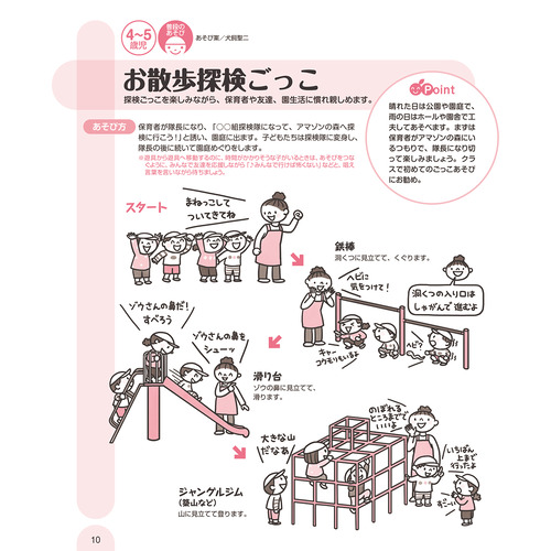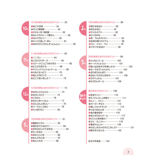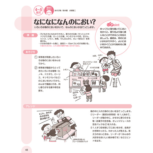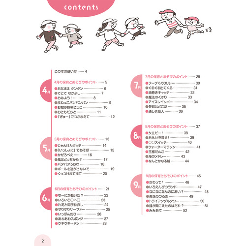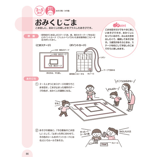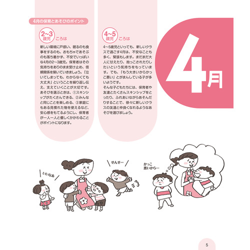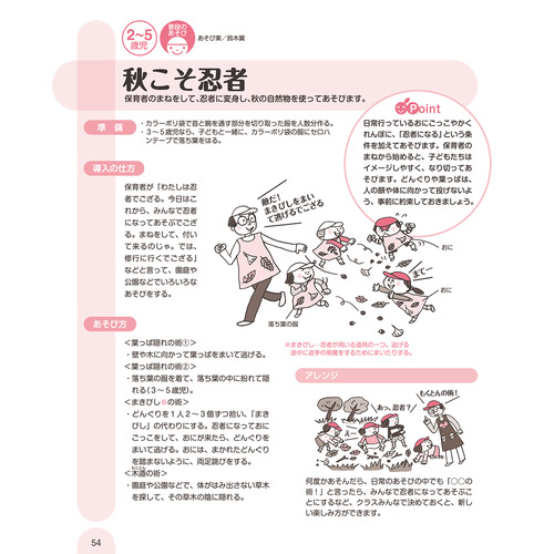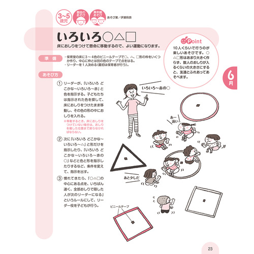 2歳から5歳児までの手あそび・歌あそびから運動あそびを、1つの学齢に限らず、複数の学齢に合わせてあそびの応用を紹介。12か月の季節や行事に沿った形で紹介するので指導案もたてやすい形に。持ち運びに便利なハンディーサイズ。【サイズ】B5変 128ページ