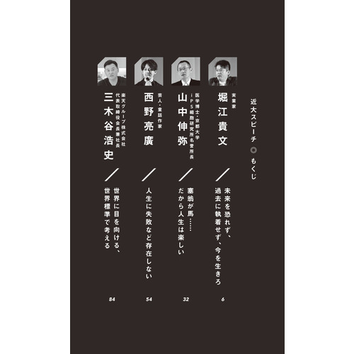 近畿大学の卒業式・入学式で行われる、多方面で活躍するスペシャルゲストやプロデューサーによる卒業生・入学生への激励メッセージ。毎年の恒例行事として、春が近づくと「今年は誰が?」と話題を呼び、そのスピーチ内容もニュースとなり、YouTubeでは多数の再生回数を誇る【伝説のスピーチ】を『近大スピーチ』として書籍化!