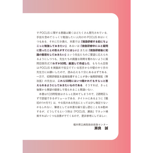【内容紹介】検査室で行わない超音波検査=POCUS(ポイント・オブ・ケア超音波)は,非侵襲的に患者の状態を即座にアセスメントできる強力なツールとして普及しつつあります.主に救急分野で奮闘する研修医のために,初歩的なギモンから使いこなし方まで,50項目に絞ってPOCUSの伝道師,瀬良誠先生が丁寧に解説します!Web動画付き.