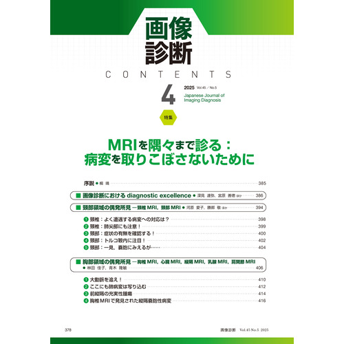 画像診断において患者の安全を担保するための取り組みと、各領域における“偶発所見”について、実際の症例をもとに具体的な対応方法を掲載。病変を発見した後も、適切で推奨される対応を行う姿勢を養える、ビギナー必携の特集!