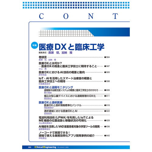 【内容紹介】医療DXによって、臨床工学の分野においても業務の効率化や遠隔モニタリング、院内外でのAI機能の活用などが推進されてい。医療現場の人材不足や患者の通院負担の解消などを目指した、各病院の医療DX事例が学べる特集!