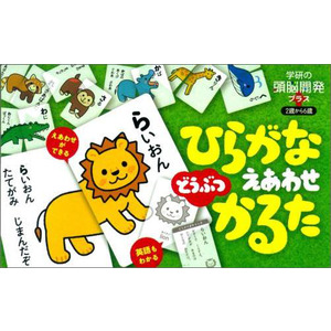 らいおん、きりんなど動物の名前で、ひらがな46文字を覚えるかるた。遊びながら、ひらがなに親しみ、覚えることができる。取り札の裏には動物の英語名、読み札の裏には動物の豆知識がのっている。取り札と読み札の絵で、動物絵あわせ遊びもできる。