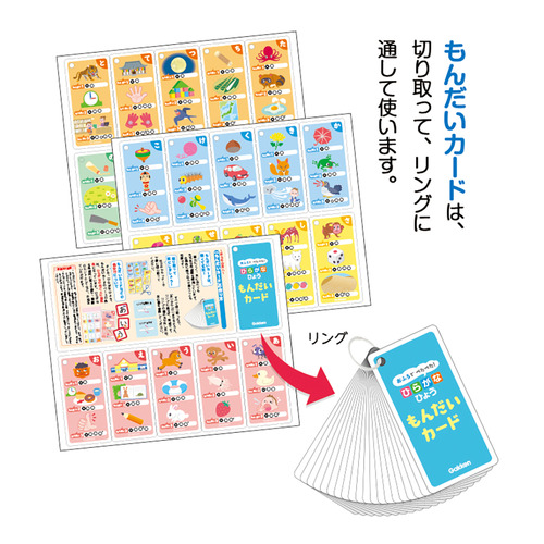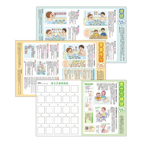 ■言葉作りできるかな?……「タイル」と「もんだいカード」を使います。各ひらがなに3問のクイズを掲載し、少しずつ難しくなっています。もんだい1は、2~3歳が目安。ひらがなひょうの言葉とイラストを掲載。2文字のものが中心。もんだい2は、3~4歳が目安。文字数が多くなった言葉で、語彙を増やします。もんだい3は、5~6歳が目安。濁音や拗音などが入っている、文字数の多い言葉になっています。音読はもちろん、ひらがなを並べて言葉にすることを学びます。また、濁点や半濁点などの使い方もマスターします。最終的には、もんだいカードを使わずに、おうちの方のランダムクイズを出題しましょう。