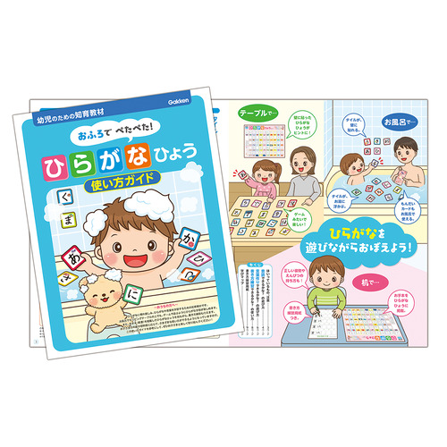 0~6歳は、お子さまの知能や言語能力も大きく伸びる時期です。聞く・話す・読む・書くといった技能を身につけることで、思考力や感性などの能力にも大きく関わっていると言われています。『おふろで ぺたぺた! ひらがなひょう』は、小学校入学まで、お風呂やリビングテーブルでクイズやゲームのように楽しく遊びながら、ひらがなを学ぶことができます。また、おうちの方とのコミュニケーションを通して、お子さまのやる気を引き出したり、学びを習慣化させたりと、非認知能力の育成ツールとしてもご活用いただけます。