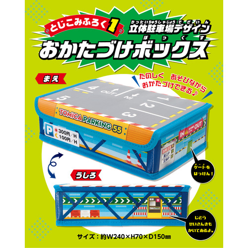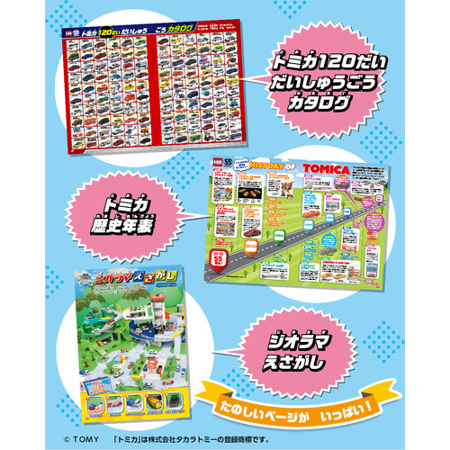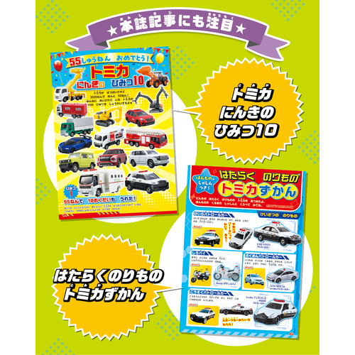トミカ55周年を記念したスペシャルムック。トミカ図鑑、歴史年表、グッズ紹介、おでかけ情報など、トミカ好きも大満足の充実した内容。付録はおかたづけが楽しくなる、立体駐車場デザインのおかたづけボックス。切りはなして遊べるタウンマップも。【サイズ】A4 24ページ