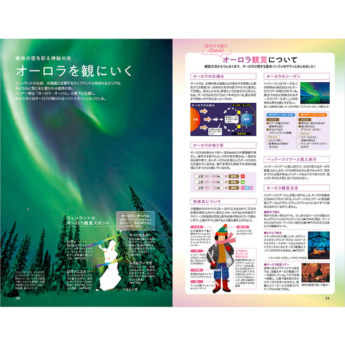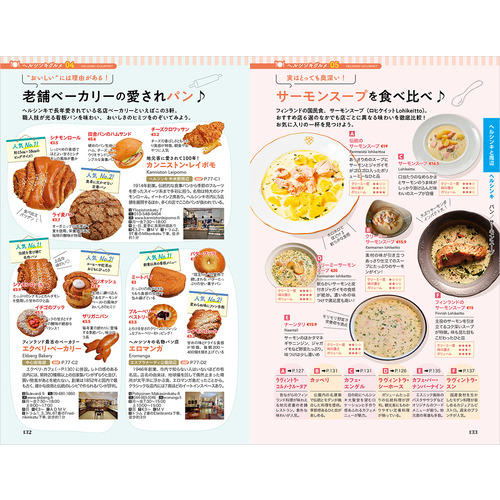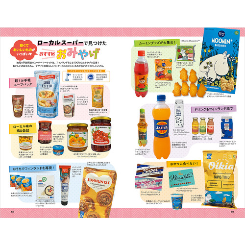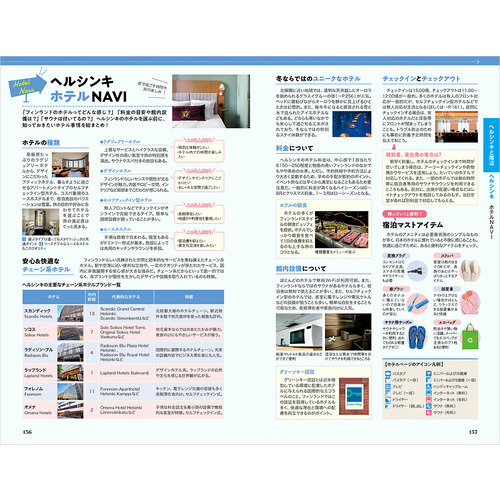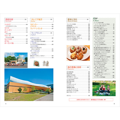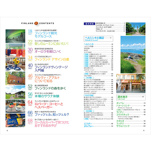 地球の歩き方的モデルコース / 愛しのムーミンに会いたい! / オーロラ鑑賞 / フィンランドデザイン白書 / フィンランドの有名ブランドカタログ / フィンランドの森を歩く / サウナ体験 / ロバーツコーヒーとヘスバーガー / ファッツェル知っツェル? / スーパーマーケットを極める / ヘルシンキ王道おさんぽコース / ヘルシンキマーケット探検 / エストニア タリン旧市街 など
