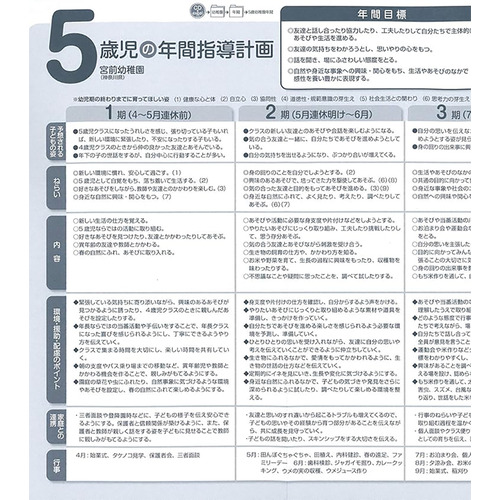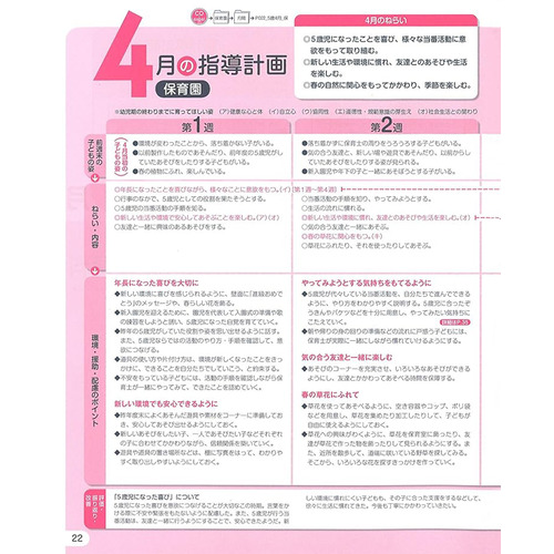 園の実践を追った指導計画と保育資料集。ねらいから実践、反省と評価のポイントがよくわかる。カラーで環境構成紹介の他、5歳児の発達解説、エピソード記録の書き方なども掲載。教育要領、保育指針等の改訂(定)を受け、計画に生かしたい解説を追加。【サイズ】AB 160ページ