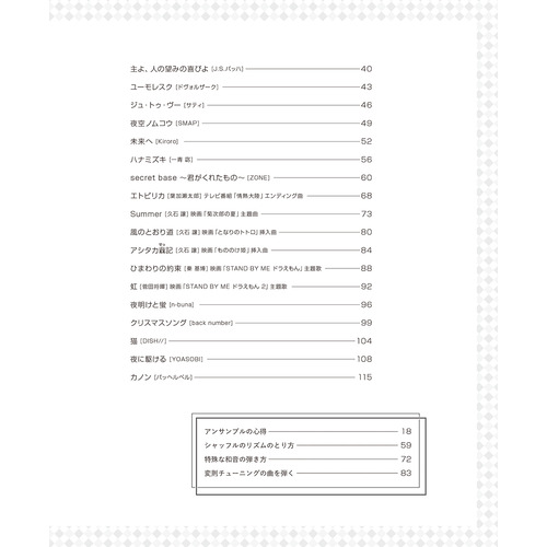夜空ノムコウ(SMAP)、ハナミズキ(一青窈)、未来へ(Kiroro)、Secret Base 君がくれたもの(ZONE)、クリスマスソング(back number)*kokomuで発売中の楽譜とほぼ同じアレンジです 夜明けと蛍(n-buna)、猫(DISH// )、夜に駆ける(YOASOBI)