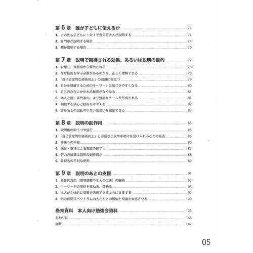 安堵し、罪悪感から解放される/なぜ技術を学ぶ必要があるのかを、正しく理解できる/「自己否定的な技術向上」の回避に役立つ/自分を理解するためのキーワードに気づきやすくなる/自己の存在にかかわる秘密がなくなる/本人と親・専門家の、より強固なチームが形成される/相談する決心と技術をはぐくむ/診断名との混乱の少ない出会いを設定できる