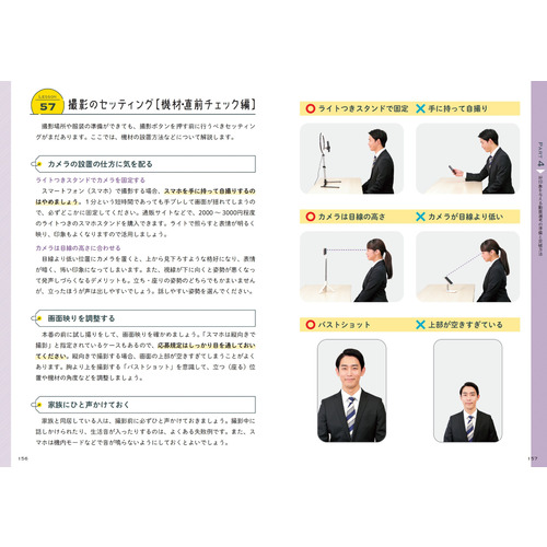 近年増えつつある「動画選考」(自己PR動画・録画面接)もカバー。撮影場所や服装、撮影機材の選び方、動画ならではの印象アップ術など、ライバルと差をつけるポイントを写真・イラスト付きでわかりやすく解説します。