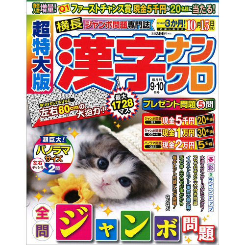 綴じ込んである問題をひろげると、左右80センチのジャンボな漢字ナンクロが出現。スタンダードからホワイトまで本格派も満足の24問収録。さらに毎号4問には、1万円が各10名に当たる懸賞つき。ジャンボサイズの決定版です。※定期購読をご希望の方はこちら