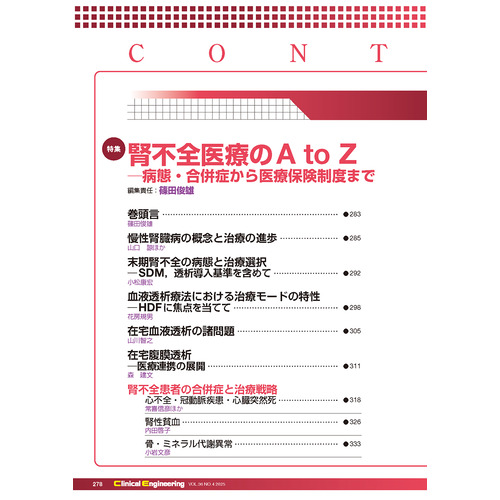 【内容紹介】透析患者の病態・合併症とそれらの治療法に加え、慢性腎臓病の概念や、今日の在宅血液透析と在宅腹膜透析の近況、さらには最新の医療保険制度まで幅広い情報が満載!透析療法に携わる臨床工学技士にとって役立つ特集!