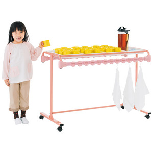 幼児がコップなどを自分で取って片付けられるよう、間仕切りのついたトレーがはめてあるフックスタンドです。トレーについている間仕切りは、取り外しが可能。トレー自体も取り外しができるので、さまざまなシチュエーションに合わせてお使いいただけます。 キャスター4か所(ストッパー付)・フック24個付・組立式